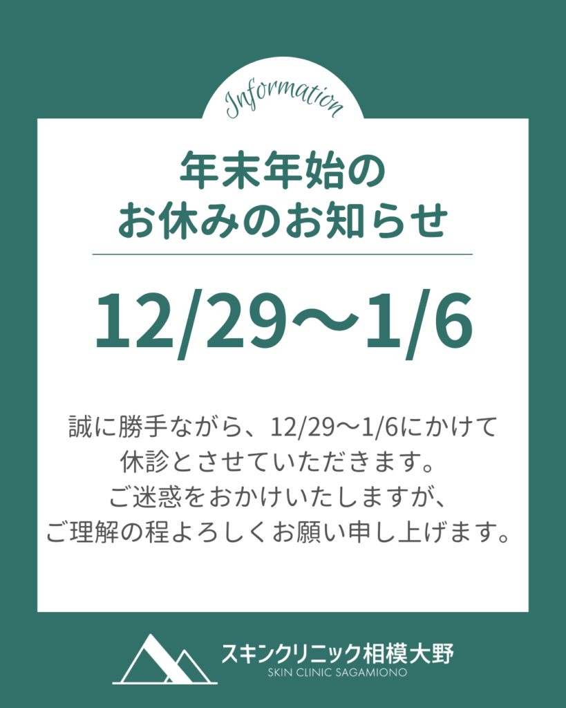 年末年始の診療についてのお知らせ 2025年11月28日 お知らせ 誠に勝手ながら、2025年12月29日~2026年1月6日まで、当院は休診となります。 ご理解の程よろしくお願い申し上げます。 URL Copied!
